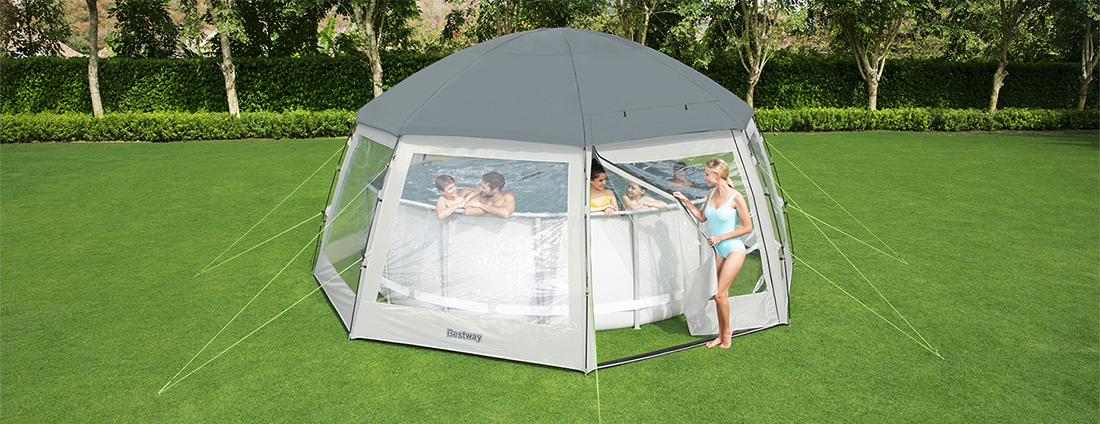 L'abri de protection Bestway pour piscine constitue une protection contre le vent, les intempéries et les animaux. Grâce à lui votre piscine dispose d'un dôme spacieux et ajouré avec 8 grandes fenêtres transparentes en paroi.