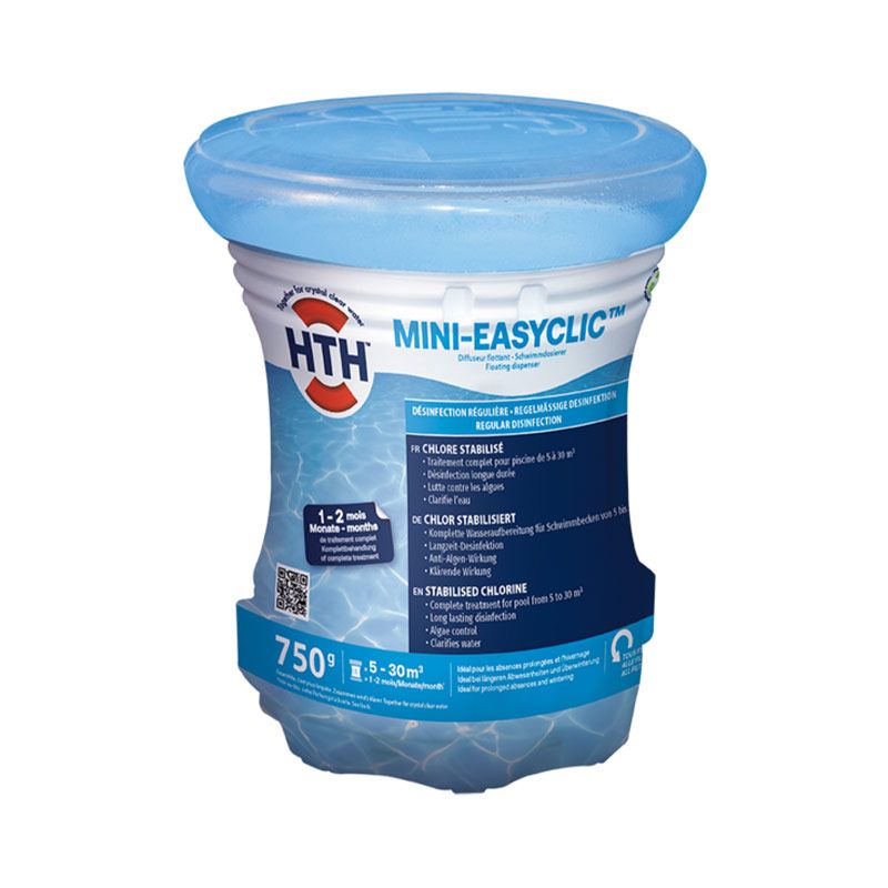 HTH Easyclic Mini est un traitement complet adapté aux petites piscines de moins de 30m³. Il se présente sous la forme d'un petit diffuseur flottant qui assure à lui seul le traitement multi-actions pendant une période d'1 à 2 mois une fois le pH bien ajusté.
