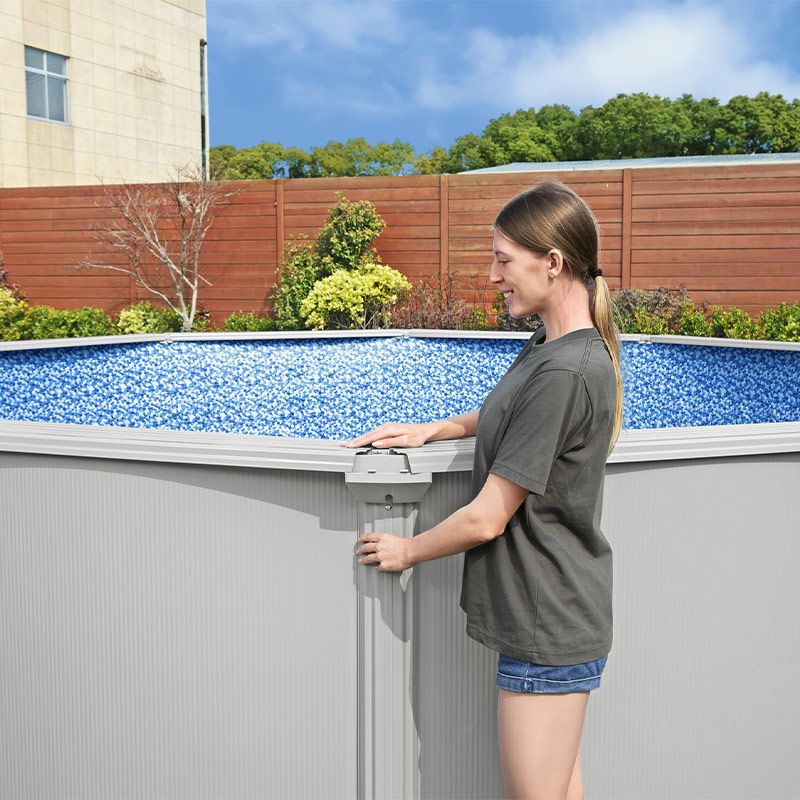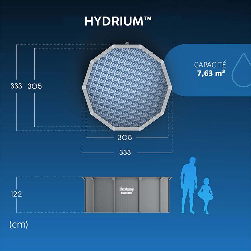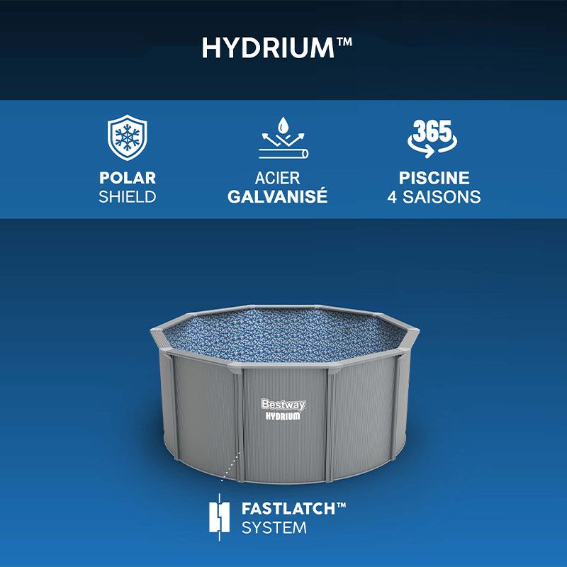 Hydrium est une piscine hors-sol acier fabriquée par Bestway, destinée à résister aux conditions météo pour pouvoir rester dans votre jardin 365 jours par an sans avoir besoin d'être démontée une fois l'été passé. Les matériaux qualitatifs tels que l'acier renforcé utilisé pour la fabrication de la structure de la piscine, lui assurent une excellente tenue face aux agressions des rayons UV du soleil, à la rouille ou à la corrosion. Très facile à monter, elle est particulièrement appréciée par les familles car elle dispose d'une hauteur de 1,22m qui permet les activités de nage ou de jouer en famille. Les margelles qui entourent la piscine disposent de cache-angles à visser qui viennent parfaire la finition exceptionnelle de ce produit phare du catalogue Bestway.