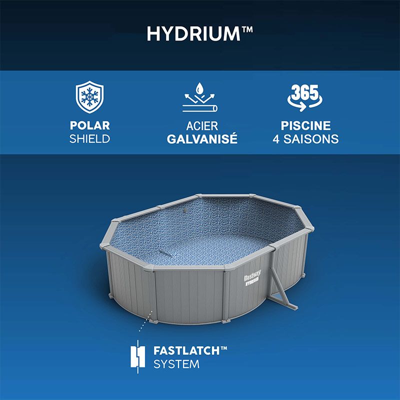 Optez pour la piscine acier Bestway Hydrium 365, c'est la piscine hors-sol ovale parfaite pour ceux qui souhaitent la laisser dans le jardin sans la démonter entre deux saisons de baignade. Grâce à son système de fixation rapide de la paroi appelé Fastlatch, comptez environ 3 heures avec 3 personnes pour monter sans difficulté cette piscine robuste au coeur de votre jardin (hors préparation du terrain et remplissage). La paroi en acier offre une durabilité et une haute résistance aux dommages car elle est renforcée pour résister à la rouille, à la corrosion, et elle intègre une protection hivernale Polar-Shield qui renforce sa résistance durant l'hiver. Les jambes de force positionnées sur les longueurs assurent quand à elles une parfaite stabilité de la structure au fil des années. Les margelles extra larges au dessus des parois acier offrent un rendu haut de gamme et un parfait soutien tout au long de l'année.
