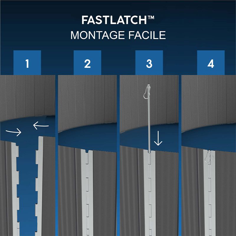 | Dimensions extérieures (hors jambes de force) : | 6,17 x 3,71m | Paroi acier : | Acier renforcé anti rouille et corrosion Technologie Fastlatch rapide à monter |