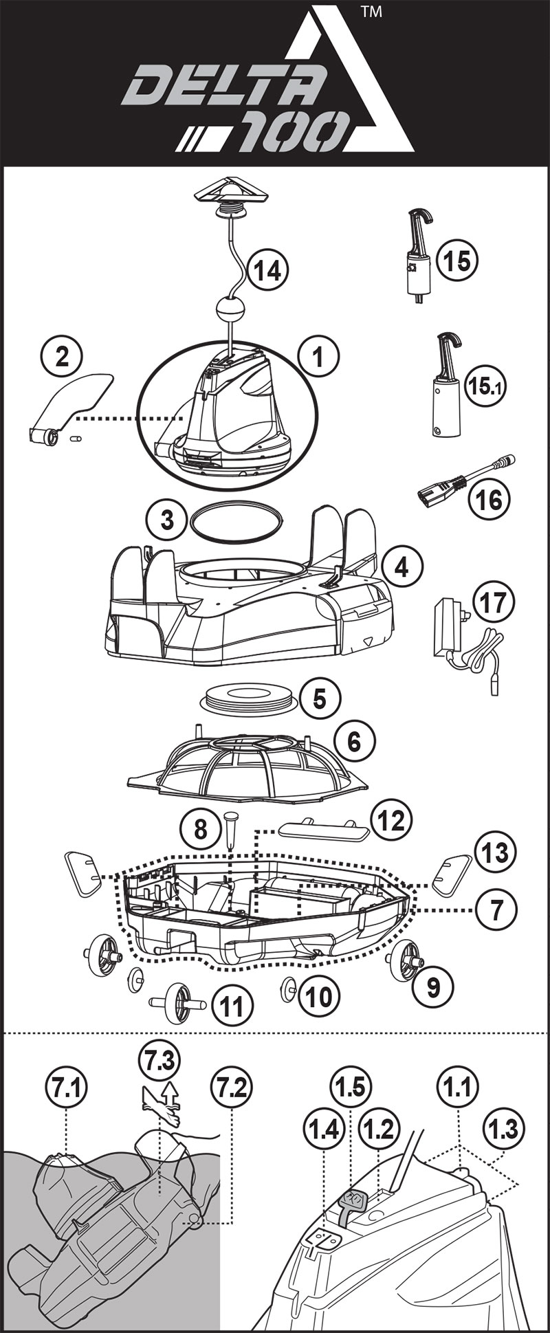 Parcourez la liste des pièces détachées ci-dessous et visualisez leur position grâce à la vue éclatée du robot Delta 100 Kokido et vous pourrez commander en quelques clics la pièce recherchée pour réparer ou prolonger la durée de vie de votre robot sans fil pour piscine. Toutes les pièces référencées sont celles d'origine : c'est la garantie d'une parfaite compatibilité et de performances préservées.