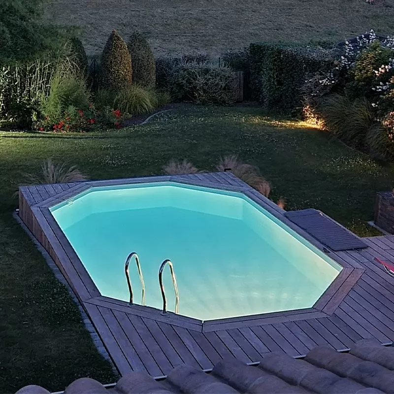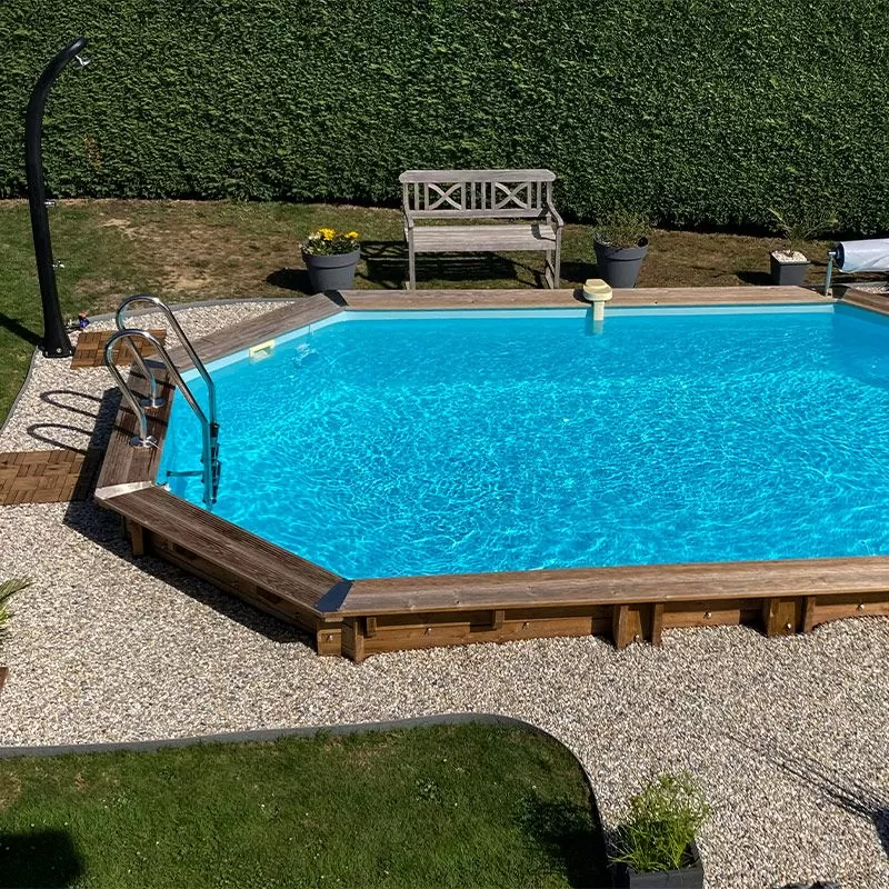 La piscine bois Wasabi, avec ses dimensions idéales de 6,20 x 3,95m et sa hauteur de 1,27m, offre un grand espace de baignade tout en limitant son encombrement grâce à sa forme octogonale. Conçue pour satisfaire les nageurs en quête de liberté et les familles qui aiment se retrouver pour des moments de jeu, elle s’installe aussi bien hors-sol sur une dalle béton existante qu’en version enterrée, selon vos envies et les instructions de la notice.