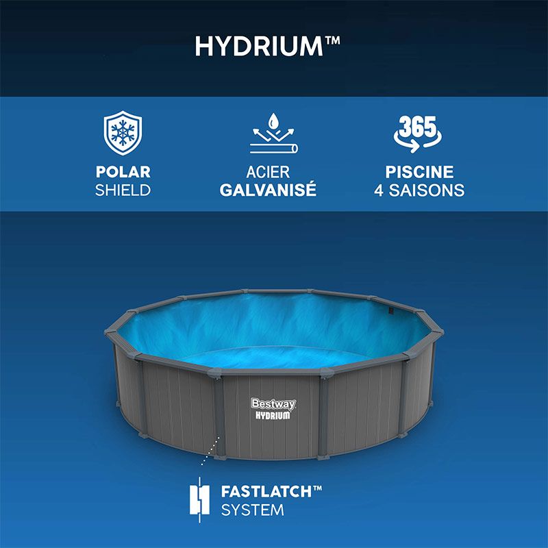 La nouvelle génération de piscine acier Bestway Hydrium 365 se monte encore plus facilement grâce au système "Fastlatch" permettant une fixation rapide et simple de la paroi. Il vous faudra seulement 3 heures avec 3 personnes (hors préparation du terrain et remplissage) pour réaliser toutes les étapes de cette construction ultra-simplifiée, puis une fois remplie cette piscine pourra rester toute l'année dans votre jardin sans nécessiter de démontage puisqu'elle intègre le bouclier Polar-Shield qui assure une protection hivernale de la paroi. Choisir la piscine acier Hydrium Bestway, c'est prendre le parti d'un bassin fait pour durer, grâce à ses matériaux solides et à son coloris gris foncé, intemporel.