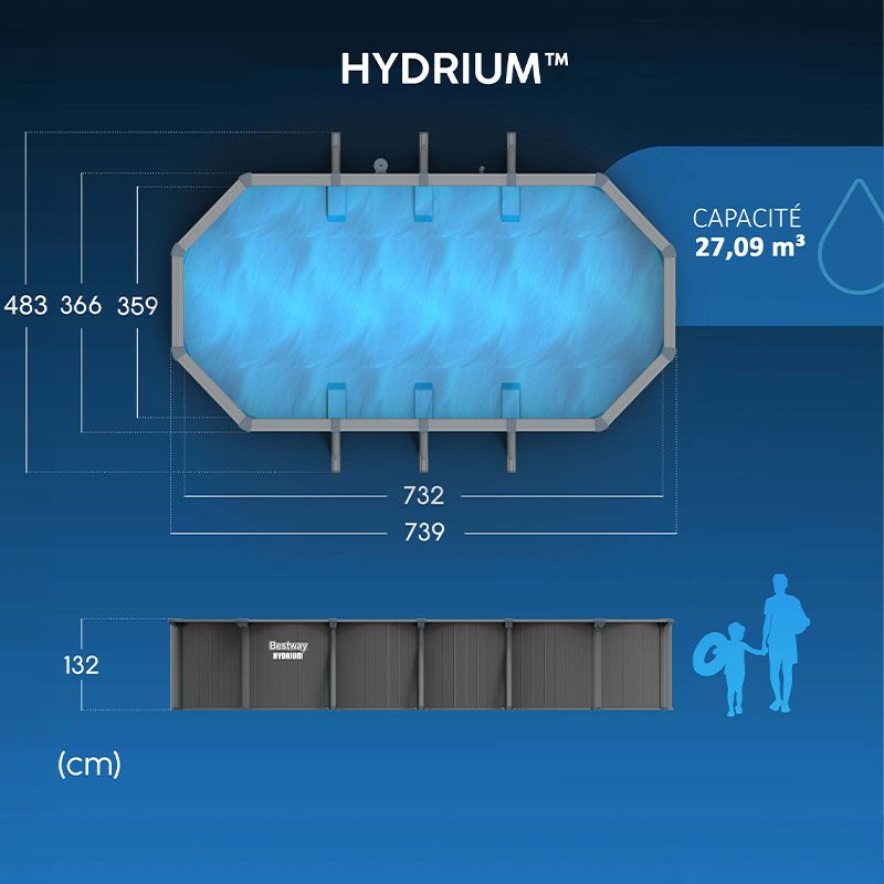 La nouvelle génération de piscine acier Bestway Hydrium 365 se monte encore plus facilement grâce au système "Fastlatch" permettant une fixation rapide et simple de la paroi. Il vous faudra seulement 3 heures avec 3 personnes (hors préparation du terrain et remplissage) pour réaliser toutes les étapes de cette construction ultra-simplifiée, puis une fois remplie cette piscine pourra rester toute l'année dans votre jardin sans nécessiter de démontage puisqu'elle intègre le bouclier Polar-Shield qui assure une protection hivernale de la paroi. Choisir la piscine acier Hydrium Bestway, c'est prendre le parti d'un bassin fait pour durer, grâce à ses matériaux solides et à son coloris gris foncé, intemporel.