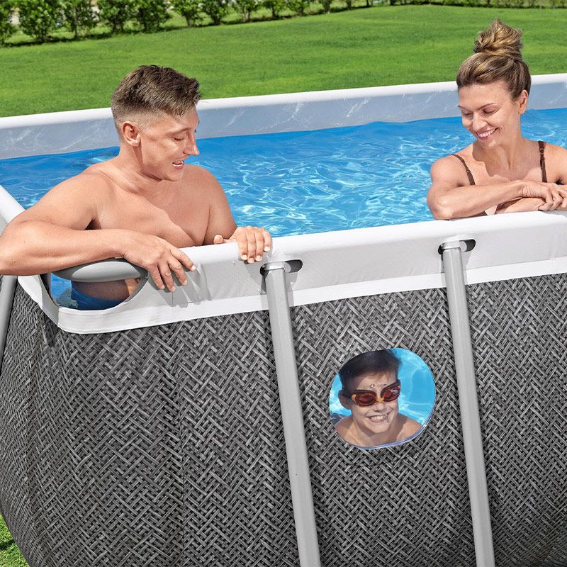 Bestway Steel Pro Max Splashview incarne la piscine familiale idéale, alliant solidité, praticité et amusement pour petits et grands. Son design raffiné, inspiré du rotin tressé, s’harmonise parfaitement avec tous les jardins, tandis que ses grandes fenêtres transparentes transforment chaque baignade en une aventure immersive. Les enfants adoreront explorer ce monde aquatique, protégés par leurs lunettes de plongée, et les parents apprécieront la durabilité du liner Tritech, doté d’une élégante finition givrée. Grâce à sa filtration à cartouche hautement efficace, l’eau reste cristalline, pour des moments de détente ou de jeux sans compromis.