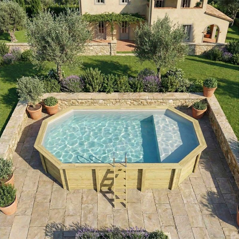 Piscine bois octogonale avec plage immergée Altanka Nemo 7,30 x 3,97 h1,45m en vue d'ensemble