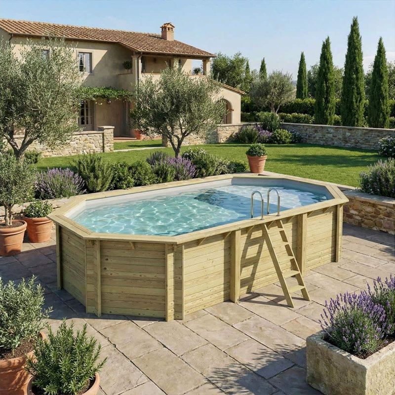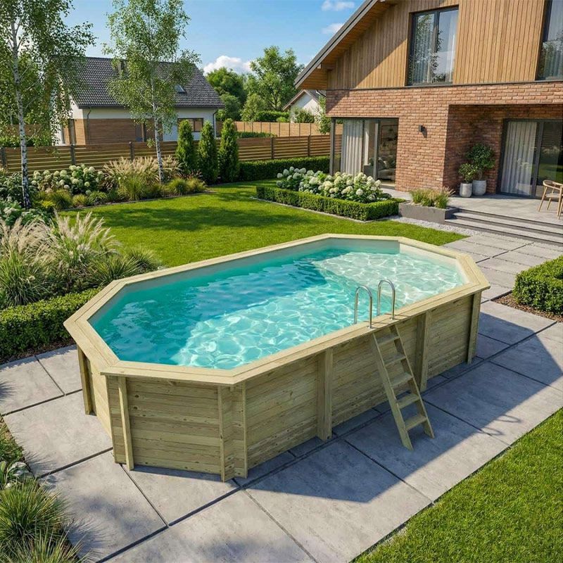 Piscine bois ovale avec plage immergée Altanka Nemo 7,30 x 3,97 h1,45m dans un jardin ensoleillé sur dalle béton
