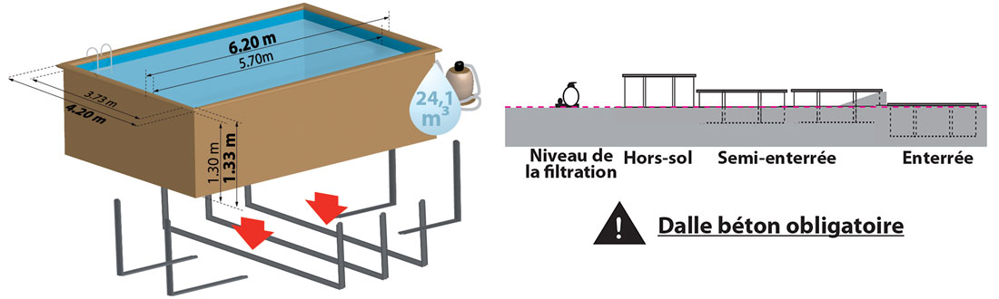 | Dimensions extérieures : | 6,20 x 4,20 x h1,33m | Coloris liner : | Bleu uni |